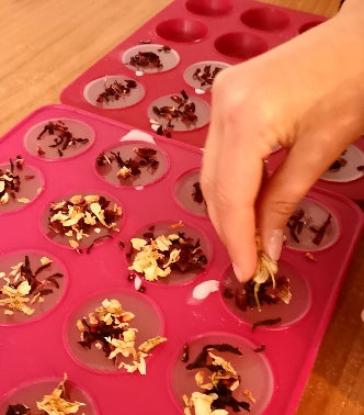 Les produits sont décorés avec des fleurs et pétales séchés, des paillettes végétales et des micas.